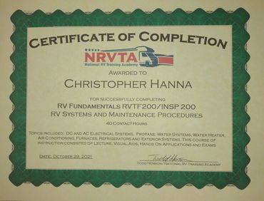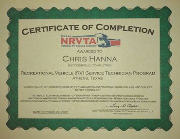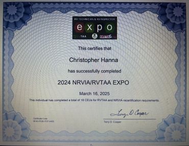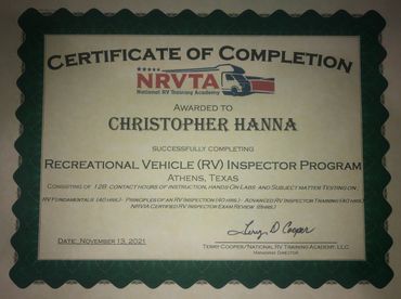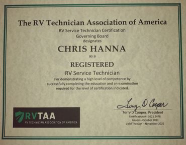Chris & Kelly Hanna are Discovery RV Services, LLC's Owners / Operators. Chris is a Patriotic USAF Veteran and a proud father of a daughter currently enlisted in the United States Air Force and a son that has completed his service also in the United States Air Force following in the long family tradition of serving this great nation. Chris is a 26 year employee for a utility company where he has worked as a commercial gas / electric designer and a gas distribution engineering designer. Chris and his wife Kelly started the RV Lifestyle shortly after getting married in 1999, when they purchased a 19ft Hybrid Travel Trailer. As their family quickly grew they experimented with everything from small travel trailers to large 5th wheel campers. As the world of remote working grew and their kids leaving for military service, the Hanna's with dog Maddie decided to sell everything including the home and move to full time RV. With having owned so many RV's and experiencing so many unsatisfactory quality issues, Chris & Kelly wanted to help other people work through those stressful times. This drive of helping led Chris to become a Registered RV Technician and Certified RV Inspector by taking courses offered through the NRVTA in Athens, Texas.